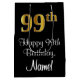 Este elegante, elegante y sofisticado diseño de bolsos de regalo de cumpleaños presenta un gran número ordinal "99º" con un aspecto falso/imitación de oro, además del mensaje de bienvenida de cumpleaños "Feliz cumpleaños 99º", y un nombre de destinatario personalizado con un tipo de letra estilo script. El fondo es negro de color. Una elegante bolsa de regalo con tema de cumpleaños como esta puede ser usada cuando se da un regalo o regalo para la celebración del cumpleaños 99 de alguien. [~Z0000514]