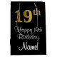 Este elegante, sofisticado y lujoso diseño de bolsos de regalo de cumpleaños incluye un gran número ordinal "19th" con un aspecto imitativo/falso de estilo dorado, además del mensaje de bienvenida de cumpleaños "Feliz 19th Birthday", y un nombre de destinatario editable con un tipo de letra estilo script. También tiene un fondo de color negro. Una elegante bolsa de regalo con temas de cumpleaños como esta puede ser una manera divertida de envolver un regalo o regalo para celebrar el cumpleaños 19 de alguien. [~Z0000514]