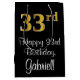 Este elegante, lujoso y elegante diseño de bolsos de regalo con temática de cumpleaños cuenta con un gran número ordinal "33" con un aspecto imitación/falso de inspiración dorada, además del mensaje de bienvenida de cumpleaños "Feliz cumpleaños número 33", y un nombre de destinatario personalizado con un tipo de letra estilo script. También tiene un fondo de color negro. Una bolsa de regalo como esta podría ser usada para envolver regalos que se le dan a alguien en celebración de su 33 cumpleaños. [~Z0000514]