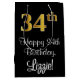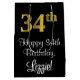 Este sofisticado, elegante y lujoso diseño de bolsos de regalo con temática de cumpleaños presenta un gran número ordinal "34th" que tiene un patrón de gradiente similar al oro imitación/faux, junto con el mensaje de bienvenida de cumpleaños "Feliz cumpleaños número 34", y un nombre de destinatario de personalizable con un tipo de letra estilo script. El fondo es negro de color. Una elegante bolsa de regalo con temas de cumpleaños como esta podría ser una manera divertida de envolver un regalo o regalo para alguien que esté celebrando su 34 cumpleaños. [~Z0000514]