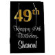 Este sofisticado, elegante y lujoso diseño de bolsos de regalo con temática de cumpleaños presenta un gran número ordinal "49th" con un aspecto de imitación/faux de oro, junto con el mensaje de bienvenida de cumpleaños "Happy 49th Birthday" y un nombre de destinatario personalizado con un tipo de letra estilo script. El fondo es negro de color. Una elegante bolsa de regalo como esta se puede usar cuando se le dan regalos al envasado a alguien en celebración de su 49 cumpleaños. [~Z0000514]