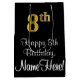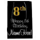 Este elegante, sofisticado y lujoso diseño de bolsos de regalo con temática de cumpleaños presenta un gran número ordinal "8th" que tiene una apariencia de imitación/faux de oro, además del mensaje de bienvenida de cumpleaños "Happy 8th Birthday", y un nombre de destinatario personalizado con un tipo de letra estilo script. El fondo es negro de color. Una bolsa de regalo con temas de cumpleaños como esta puede ser usada cuando se da un regalo o regalo para la celebración del octavo cumpleaños de alguien. [~Z0000514]