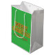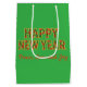 Unique colorful green holiday gift bag with "Merry Christmas" in bold gold letters filled with a red and green design to greet the receiver, delight your family and friends with a special message, "with lots of love" in red which can be changed and personalized for the recipient and Happy New Year on the other side.