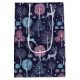 A modern abstract pattern with white deer leaping and prancing against a night blue background filled with turquoise blue and purple trees.