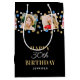 Crea un elegante bolso de regalo de collage de fotos con ocho fotos favoritas! Personalice la plantilla con el nombre del destinatario y la edad de cumpleaños. Un diseño elegante con confeti, estrellas y fotografías en forma cuadrada, perfecto para la familia y los amigos. Colores impresos: azul, negro, blanco y elementos falsos de oro.
