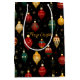 Una bolsa de regalo de Navidades coloridos y brillantes, con el diseño de adornos de baudibles de árboles brillantes en colores brillantes de rojo dorado y azul, todo sobre un fondo negro. La frase "Feliz Navidad" en una fuente de color dorado se puede personalizar con cualquier saludo que sea necesario o personalizar con un nombre.