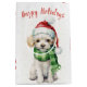 Watercolor Poodle en una bufanda de invierno roja y verde y copos de nieve. El texto es editable.