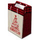 Bolsa de regalo de vacaciones para navidades mostrada en diseño de estampado de mantas de búfalo beige y rojo y negro. Personalizar este artículo o compra tal cual. La imagen de delante es de texto en forma de árbol de Navidad con una estrella en la cima. El texto es: "Alegría, paz, creencia, Navidades. Imagen de archivo freepik.com all-free-download.com