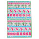 Navidades tropicales feos y de diseño de suéter con flamencos rosas, palmeras y olas de playa azules.