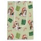 Beagle dulce con huesos de caña de caramelo, regalos y un sombrero de Santa sobre fondo verde claro.