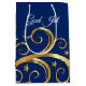 Esta bolsa de regalo de gran tamaño se muestra en unos fantásticos remolinos de colores dorados y estrellas con el texto navideño Feliz en la parte delantera. Se muestra en azul zafiro y en tono dorado. Texto en la parte superior de Dios Jul. Personalizar esta bolsa o compra como se muestra.