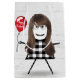 Chica de palos con pelo, vestido de manta de búfalo y gafas sosteniendo un globo rojo sobre fondo encalado para el cumpleaños. Se puede cambiar el texto en globo.