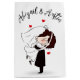 Novia y novio en un fondo blanco con corazones rojos. Los nombres se pueden cambiar.