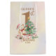 Adorable ilustracion acuático celebrando la primera Navidad de un bebé. El diseño presenta una gran "primera" marrón con la palabra "Navidades" escrita a continuación en un guión similar. Un lindo oso de peluche con sombrero de Santa y pañuelo rojo se encuentra junto a un árbol de Navidad decorado con adornos rojos y dorados, coronado con una estrella dorada. Los regalos envueltos con cintas rojas y la vegetación festiva completan la acogedora escena vacacional. Una cálida y encantadora obra de arte llena de espíritu Navidad.
