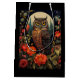 Gift bag with a cool looking owl with a piercing stare. A full moon in the back with a garden of red flowers.