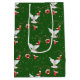 Paloma blanca con un mensaje de Navidades JOY en copos de nieve sobre fondo verde. Se puede cambiar el color de fondo.