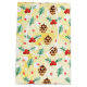 Bolsa de regalo para navidades con un lindo patrón de pinos y un hueco sobre un fondo de color amarillo con pequeños círculos blancos dispersos alrededor.