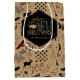 Esta divertida bolsa de regalo presenta un patrón de gráficos de aventura al aire libre que incluyen búfalo, ciervo, águila, flechas y más sobre un fondo de papel Kraft con una etiqueta negra y un diseño de texto opcional de "Deseándote un Navidad cálido, salvaje y maravilloso. Una plantilla proporcionada le permite agregar fácilmente su nombre u otro texto. Busque ID604 para ver todos los productos de coordinación de este diseño.