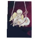 Una bolsa de regalo de temática cristiana. Diseñado con un ángel dulce con alas amarillas sosteniendo a los pastores bajo un ladrón. Sentado con corderos blanquecinos. Fondo de color azul marino y burdeos, con pequeños trozos de falso purpurina brillante de oro (no purpurina real solamente una imagen impresa). El texto dice: paz en la tierra y buena voluntad hacia todos. Feliz Navidad desde<name>.