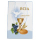 ¡Qué maravillosa felicitación regalo, recuerdo, obsequio y fiesta esencial para RCIA! Un hermoso ilustracion de símbolos sacramentales, uvas, pan, trigo, un cáliz y una paloma blanca que representa el Espíritu Santo. Esto necesitas felicitar a alguien especial por su iniciación.