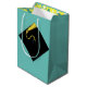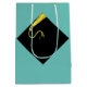 Bolsa de regalo de graduación creativa con diseño de gorra negra y dorada en fondo azul turquesa. Para personalizar, edite el texto para agregar el nombre del graduado.