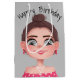Chica personalizado con ojos grandes en un fondo gris y texto Feliz Cumpleaños. El texto es modificable o se puede eliminar. Se puede cambiar el color de fondo.