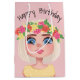 Chica personalizado lindo con pelo rubio y flores en un fondo rosa rubor y texto Feliz Cumpleaños. El texto es modificable o se puede eliminar. Se puede cambiar el color de fondo.