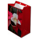 Bolsa de regalo de vacaciones de temporada con guarnición roja que muestra la foto de una encantadora dama blanca y orquídea de patinaje y festivo, Poinsettias rojas, también conocida como la flor de los Navidades. ¡Un bonito diseño floral! Seleccione su estilo de bolso de regalo.