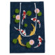 Hermoso ilustracion vectorial minimalista de coloridos peces japoneses koi nadando entre las nenúfares en un estanque. Koi es una carpa ornamental de colores vivos domesticada en Japón.