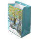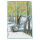 Artista de Zolotareva. Acuarela sobre seda - dibujo manual. Escena helada del bosque de invierno de nieve. el puente de piedra a través del río en el pueblo.