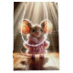 Un bonito ratón sobre un suelo de madera con bata rosa y zapatillas iluminadas por las vigas de sol para el cumpleaños. Se puede cambiar el texto.
