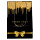 Una bolsa de favor para una despedida de soltera femenina y glamurosa. Fondo negro decorado con gotas de brillo dorado falso, aspecto de pintura goteante. Con el texto: ¡Gracias! Personaliza y añade tu nombre. El nombre está escrito con una fuente de letra manuscrita de moda con florituras. Para mantener las florituras, borra el nombre de muestra, deja los espacios o emojis delante y detrás del nombre.