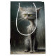 Un gatito escrupuloso de cabello largo con ojos verdes llamativos se sienta con una expresión inquisitiva contra un misterioso paisaje urbano. El texto se puede cambiar o eliminar.