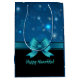 Aquí tenemos una preciosa bolsa de regalo con un patrón de copo de nieve sobre un fondo azul profundo con una bella cinta metálica azul y un arco. Las palabras "Happy Hanukkah" se pueden eliminar o personalizar para el destinatario. ¡Esta bolsa es un juego con otras bolsas de regalo, papel de envoltura, papeles de papel tisular y una tarjeta de saludo! Será una adición perfecta a su regalo para sus amigos y familia en esta temporada de vacaciones.