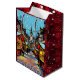 A Christmas gift bag with a cartoon depiction of the Strasbourg, France Christmas market depicting shopping booths and people walking around on a snowy winter day.