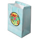 Una bolsa de regalo con la imagen de un t-rex verde usando un sombrero de top negro con corazones alrededor. El texto dice que Rawr significa que te quiero en t-rex.