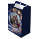 La temporada de los Navidades - una época llena de asombro, alegría, esperanza, expectativas y sorpresas. Esta bolsa de regalo contiene un torbellino de copas de nieve dorado en el cielo azul de la noche sobre el bosque invernal con una imagen de su familia, mascota o lo que le gusta! ¡Maravilloso bolso de regalo personal! Foto y color personalizado.