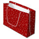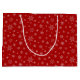 Bolsa de regalo con copos de nieve impresos en fondo rojo.
