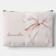 Esta es una elegante y sofisticada bolsa de maquillaje personalizada que cuenta con un fondo rosa suave adornado con un lazo grande y delicado de color rosa. El diseño emana un encanto femenino y sofisticado, perfecto para llevar tus cosméticos y artículos de belleza esenciales. La bolsa se puede personalizar con un nombre, lo que la convierte en un regalo único y considerado. Imagen de fondo de Freepik