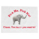 El diseño de los Elefantes Blancos muestra la imagen de un elefante blanco sobre un fondo blanco con especkles verdes y rojos. Texto en los arcos superiores sobre la imagen que dice: "¡Escoge, escoge!" con letras rojas brillantes. Debajo de la imagen, con el mismo tipo de letra roja, las palabras "¡Vamos, ya sabes que quieres!" ¡Embalaje perfecto para los fiestas del Elefante Blanco!