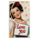 Un ilustracion vibrante en el estilo clásico de los años 50. La imagen muestra a una mujer glamurosa con rizos vintage, maquillaje audaz y una sonrisa radiante. Lleva un cartel con un mensaje de amor, "Te amo", puesto en un fondo de delicadas rosas rosas. La estética general capta el ambiente romántico y lúdico del arte de base de mediados de siglo.