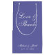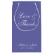 Una simple bolsa de maleza con un matiz violeta muy moderno. Sólo tiene texto blanco sobre fondo morado. El mensaje "Amor y Gracias" y los nombres de la novia y el novio están escritos en caligrafía elegante.