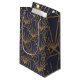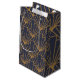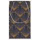 Esta bolsa de regalo tiene diseño Art Deco de diamantes y triángulos en oro sobre un campo de azul.