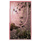 Un diseño de arte rosa, blanco, amarillo, verde y negro de la luz solar reflejado en el agua y hojas otoñales caídas.