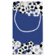 Bolas de fútbol rodean esta bolsa de regalo azul personalizada con texto editable. Múltiples balones de fútbol, diseño negro, blanco y gris para complementar nuestro equipo de invitados al partido.