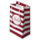 Una elegante bolsa de regalo de color rojo oscuro y blanco raya dulces pequeños. Personalice este patrón moderno añadiendo el nombre y la inicial monogramada del invitado de honor. Este elegante diseño de monograma forma parte de la colección de colores de verano de Chili Pepper Stripes Fiesta Essentials.