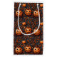 Esta bolsa de regalo festiva de Halloween presenta un patrón impecable y muy detallado de alegres calabazas talladas rodeadas de naranjas giratorias y ricas hojas. El contraste audaz de los tonos cálidos de calabaza y los acentos botánicos con un fondo verde azulado fresco, crea un diseño caprichoso y elegante, perfecto para recibir regalos de temporada espeluznante, favores de fiesta de Halloween o celebraciones de otoño.