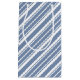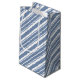 Una bolsa de regalo pequeña de moda, con un patrón de rayas azules y blancas índigo. Este patrón, que forma parte de la colección "Índigo" de Paco y Pintado, se puede ajustar fácilmente para que se ajuste a cualquier bolsa de regalo.