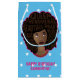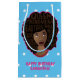 Este diseño presenta "Reina, fenomenal, bella, inteligente, mágica, jefa, amorosa, sexy, independiente, divertida, creativa y fuerte" anidada en su afro, con coloridos collares de capas con borde rosa sobre un fondo estrellado y turquesa.
