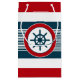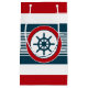 Diseño náutico con decoración de ruedas de vela en forma redonda sobre fondo rayado azul, rojo y blanco